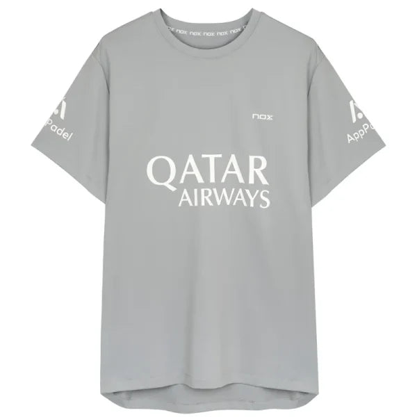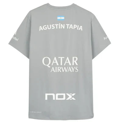 La Camiseta Nox Sponsor AT10 Gris, es la camiseta que el jugador Agustin Tapia ha llevado en la temporada 2024 en sus partidos de premier padel.
