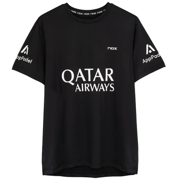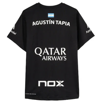 La Camiseta Nox Sponsor AT10 Negro, es la camiseta que el jugador Agustin Tapia ha llevado en la temporada 2024 en sus partidos de premier padel.